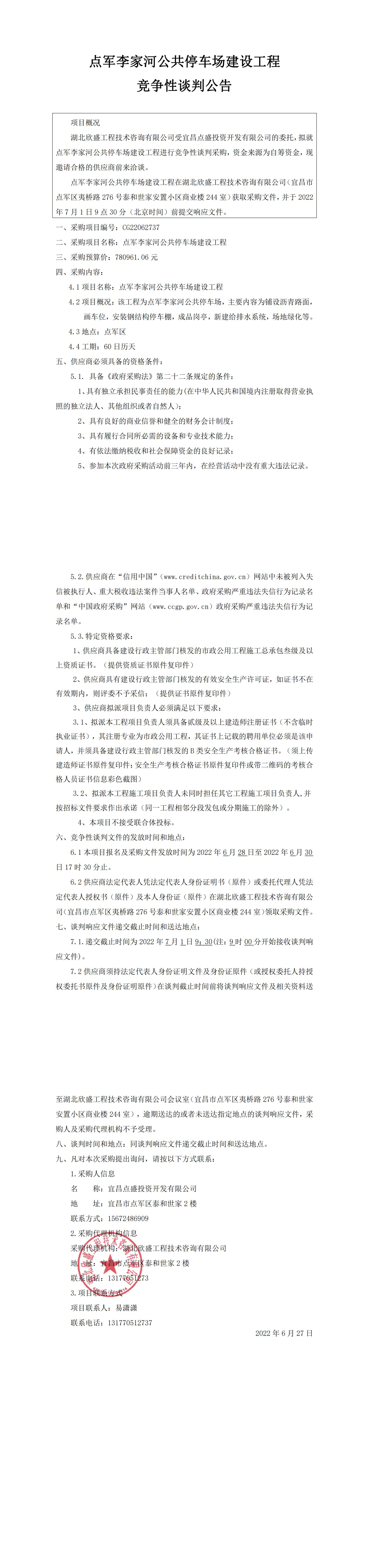 點軍李家河公共停車場建設工程競爭性談判公告