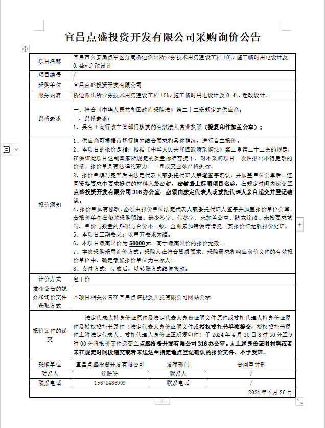 宜昌市公安局點軍區(qū)分局橋邊派出所業(yè)務技術用房建設工程10kv施工臨時用電設計及0.4kv遷改設計詢價公告