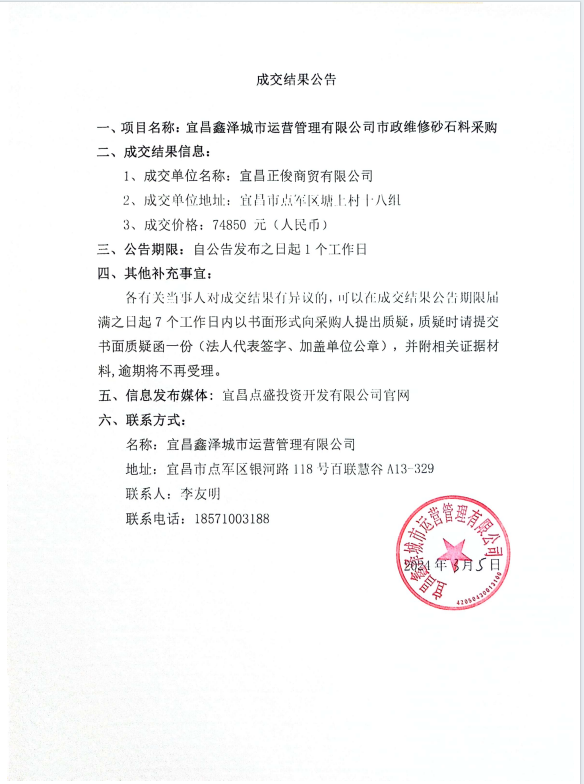 宜昌鑫澤城市運(yùn)營(yíng)管理有限公司市政維修砂石料采購項(xiàng)目成交公告