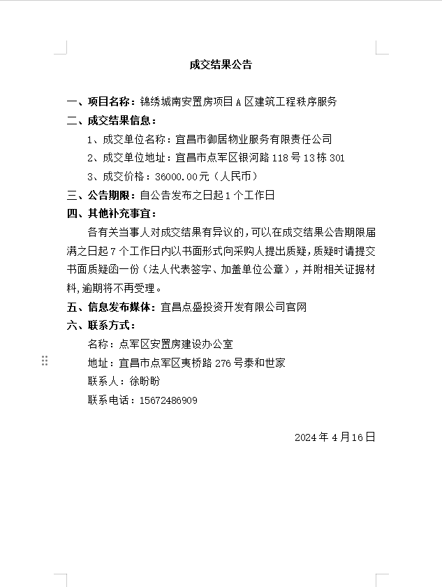 錦繡城南安置房項(xiàng)目A區(qū)建筑工程秩序服務(wù)成交公告