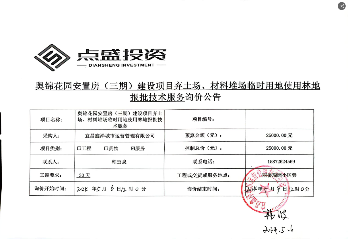 奧錦花園安置房(三期)建設(shè)項目棄土場、材料堆場臨時用地使用林地報批技術(shù)服務(wù)詢價公告