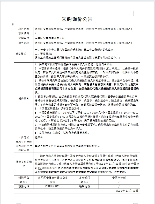 點軍區(qū)安置房零星維修、小型附屬配套類工程招標代理服務(wù)年度采購(2024-2025)詢價公告
